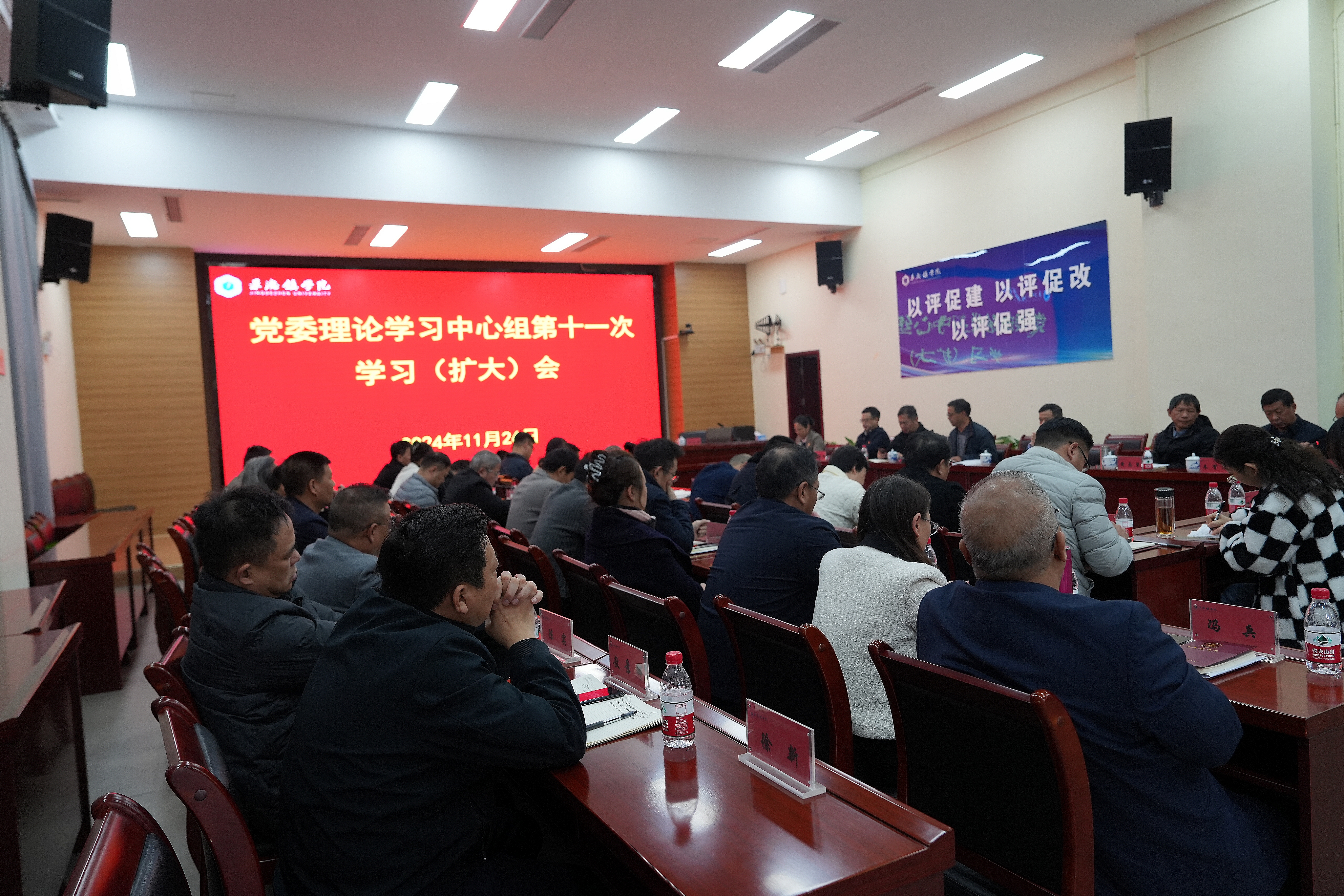 (本网讯:文|景苑轩/图|胥晴、盛佳怡、戴佳乐、谭祖鸿)11月26日下午,我校在第一报告厅召开党委理论学习中心组第十一次学习(扩大)会,围绕“深入学习贯彻习近平法治思想”开展专题学习,校党委书记叶观荣主持会议,党委副书记、校长熊震宇,党委委员、副校长方漫,副校长黄志坚,党委委员、纪委书记罗少韬,党委委员、组织部部长朱贺江,党委委员、统战部部长万文军,党委委员、宣传部部长赵雪政出席会议,江西陶瓷工艺美术职业技术学院党委宣传部负责人余民权、宣传部干部谭丽曼列席旁听。
