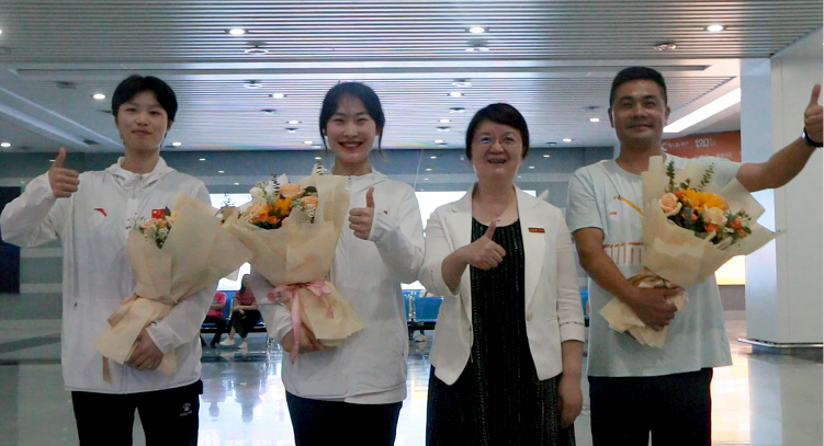 校院领导与教练张宜康和冠军王思涵、亚军钟琳琳亲切握手表示祝贺!体育学院的师生们为载誉归来的师生献上鲜花,现场掌声不断,周清平祝贺两位同学荣归,听她们讲述比赛心得,她说:"你们取得的优异成绩来之不易,是克服重重困难,日夜苦练技能,用辛勤的汗水换来的,你们为景院争了光,添了彩!希望能够将自己的比赛感悟和经验讲给你们的学弟学妹们听,感染更多同学们,一起发扬勇于拼搏、敢于胜利的精神,在未来取得更加辉煌的成绩。"