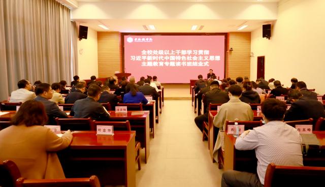 (本网讯:景苑轩)5月11日上午,我校学习贯彻习近平新时代中国特色社会主义思想主题教育处级以上干部读书班第三次集中学习暨结班式在第一报告厅举办。校党委副书记王丽心主持并讲话,党委委员、组织部部长朱贺江,党委委员、统战部部长万文军参加学习和出席结班式。