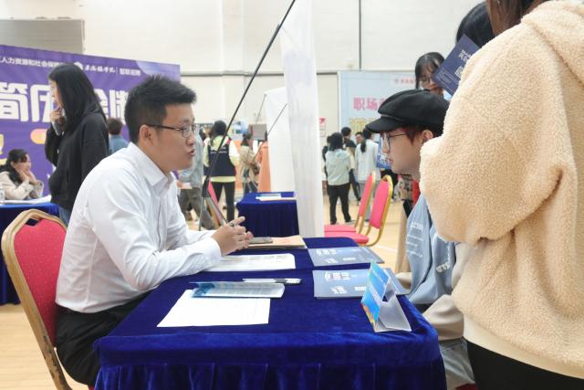招聘会现场人头攒动、秩序井然。各招聘单位通过面对面交流、小程序职位墙、发放宣传手册、设立宣传牌及海报展示等方式吸引应聘者前来咨询,现场工作人员热情提供服务,企业工作人员耐心解答学生问题,部分热门企业登记台前排起长队。毕业生们手持自己精心准备好的自荐书和简历,积极与招聘人员交流,主动了解用人单位的情况。