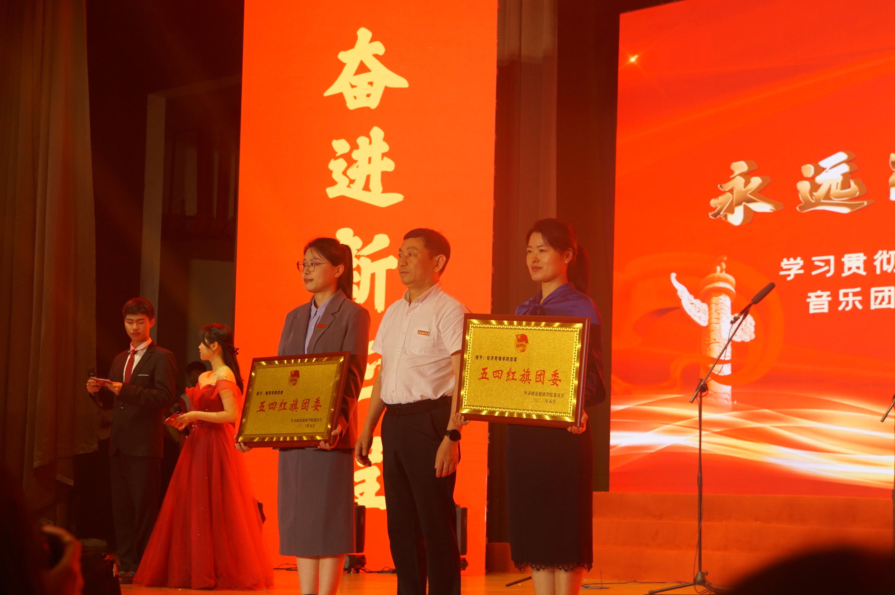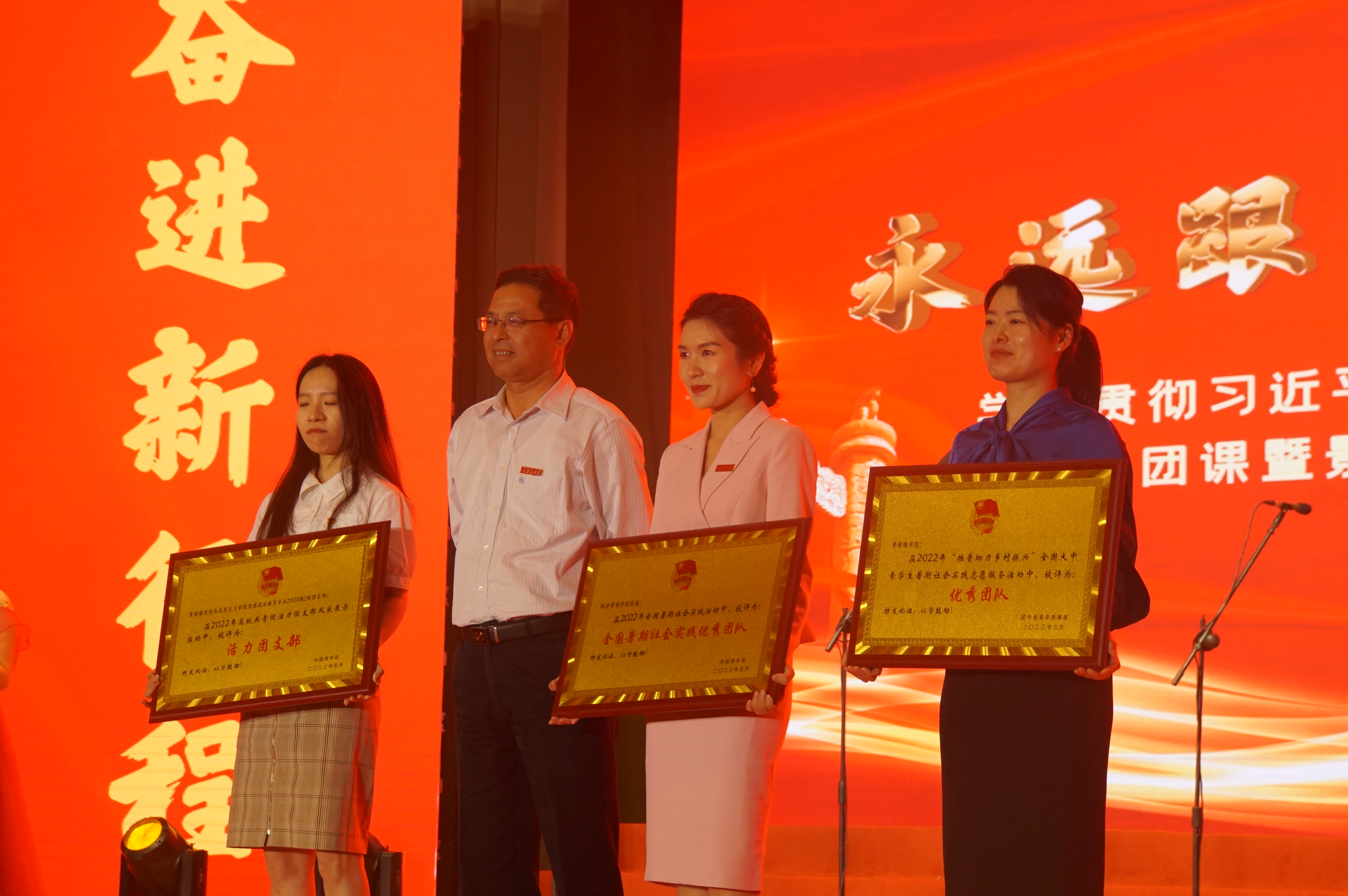 会上,叶观荣为“全国活力团支部”和“全国暑期社会实践优秀团队”颁奖。陈运平为“五四红旗团委”颁奖,王丽心为“五四红旗团支部”代表颁奖,郑昕芾为“优秀团干”代表颁奖,方漫为“十佳共青团员”颁奖,万文军为“十佳青年志愿者”颁奖。