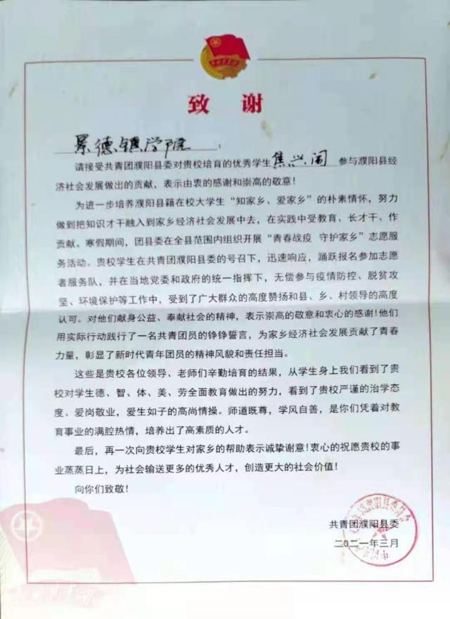 (本网讯:艾丹)近日,我校收到共青团濮阳县委发来的感谢信,感谢我校教育学院18级音乐专业焦兴闯同学在寒假期间主动奉献,积极参与“青春战疫,守护家乡”志愿服务活动。