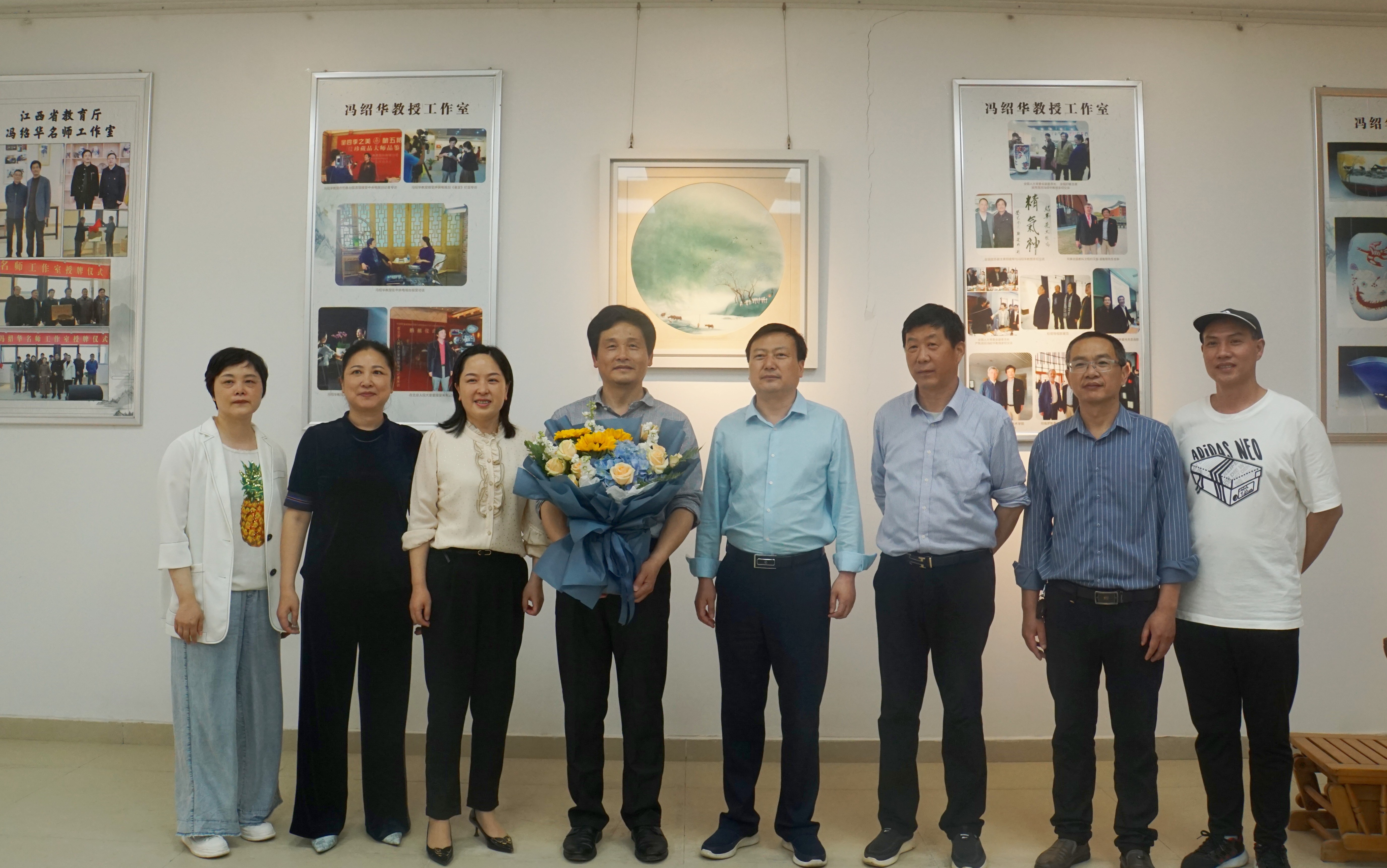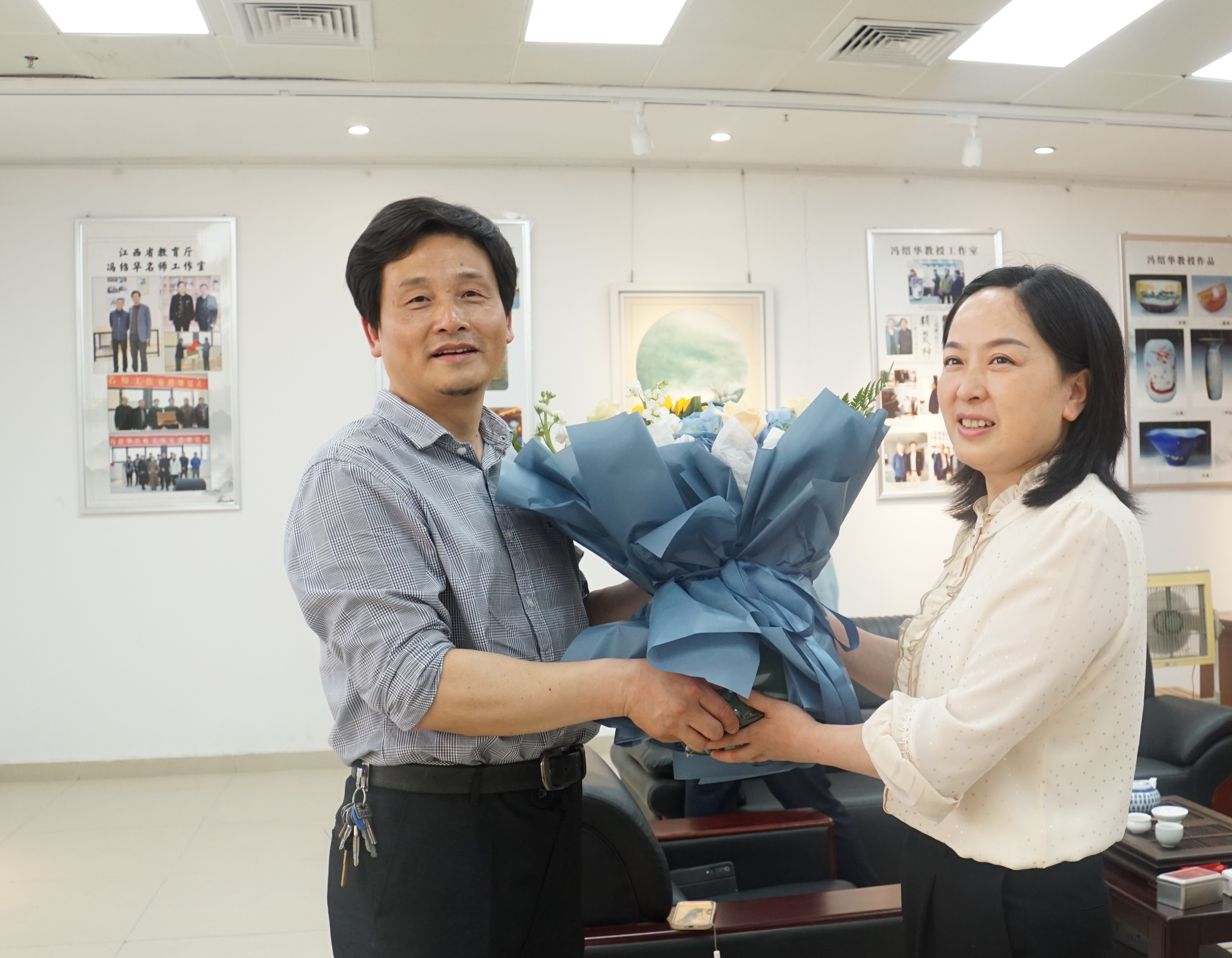 (本网讯:丁小娟)5月5日下午,民进景德镇市委会主委,景德镇市政协副主席李冬香一行来到我校美术馆西四楼江西省教育厅冯绍华名师工作室,亲切慰问2023年度全国五一劳动奖章获得者冯绍华教授。校党委副书记王丽心,校党委委员、组织部部长朱贺江,校党委委员,统战部部长万文军,校工会主席江畅,民进市委会驻会副主委徐少鸣,校工会副主席余洪权陪同看望慰问。