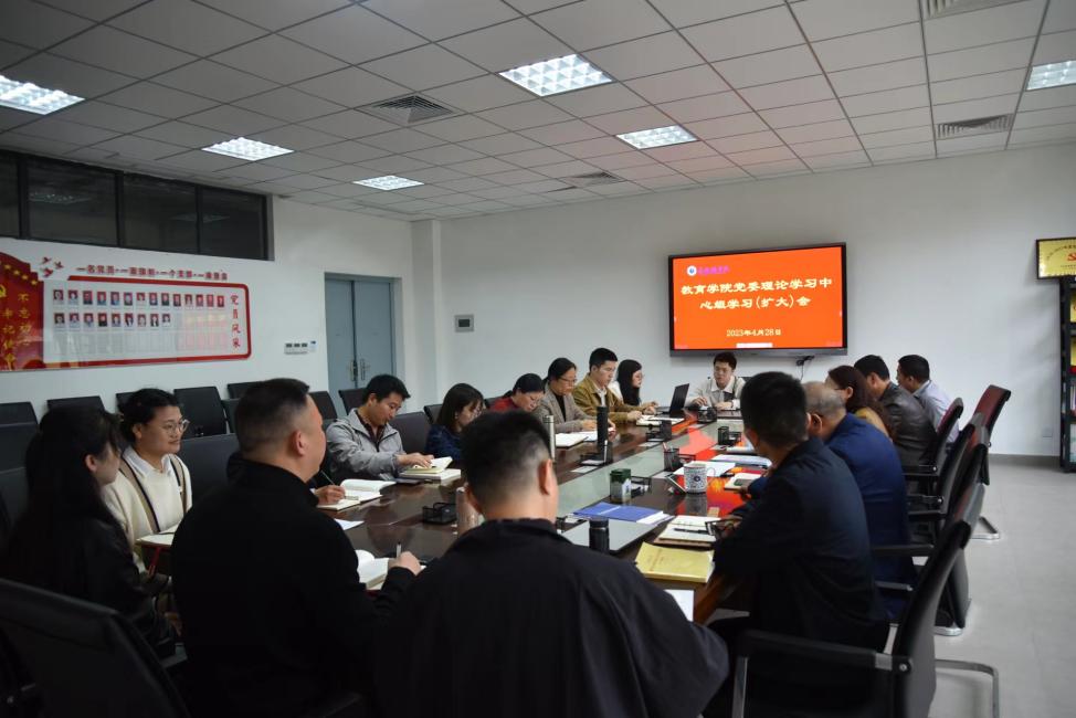 (本网讯:文|江霞琴/图|廖晨旭)4月28日下午。教育学院在党员活动室召开党委理论学习中心组学习(扩大)会,围绕学习贯彻习近平新时代中国特色社会主义思想主题教育读书班上领导班子成员所做的专题辅导报告和党课内容进行交流研讨。教育学院党委书记李莉、院长冯兵、党委副书记冯唐锴、副院长黄书生、副院长汪潇出席会议。