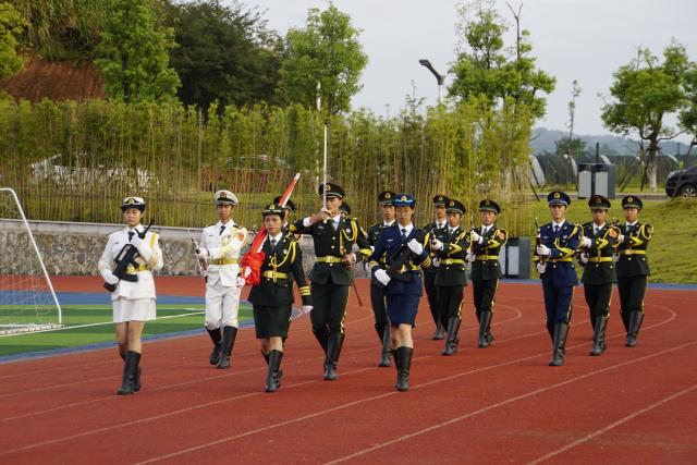 (本网讯:李婷婷)9月30日,田径场上,师生肃立,我校红旗护卫队,以挺拔的身姿,整齐的步伐,护送国旗升上旗台。迎着仲秋的朝阳,伴随着雄壮的国歌,五星红旗冉冉升起。