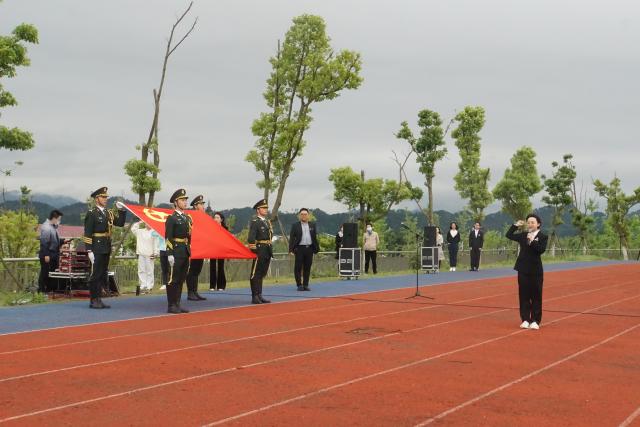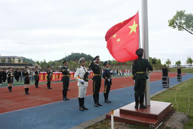 伴着庄严的国歌,五星红旗缓缓升起,全体师生肃立,行注目礼,奏唱国歌。