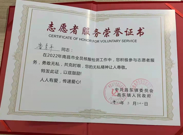 (本网讯:江霞琴)最近各地的疫情反复,防疫防控进一步升级,春寒料峭、阴雨绵绵的南昌开展全员核酸检测工作,身在南昌实习的教育学院18学前教育2班学生党员鲁彦平同学主动报名参加南昌市昌东镇党员突击队,投身到南昌市抗疫一线工作中,以实际行动体现大学生党员的责任担当,发挥学生党员的先锋模范作用。