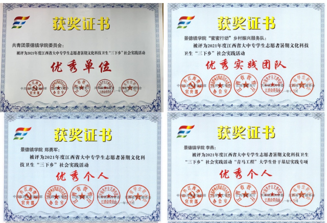 (本网讯:黄超)近日,省委宣传部、省文明办、省教育厅、团省委、省学联公布了2021年江西省大中专学生志愿者暑期“三下乡”社会实践活动获奖情况,我校荣获多项荣誉。校团委荣获江西省“返家乡”社会实践优秀单位(江西省唯一入选高校)和全省“三下乡”社会实践活动优秀单位;“蜜蜜行动”乡村振兴服务队荣获全省优秀实践团队;郑勇军、董琛、高海萍、黄靖荣获全省优秀个人;人文学院李燕荣获“青马工程”大学生骨干基层实践专项优秀个人;马克思主义学院王希琳荣获“扬帆计划”大学生实习专项优秀个人;体育学院贺学成荣获“返家乡”社会实践优秀个人。