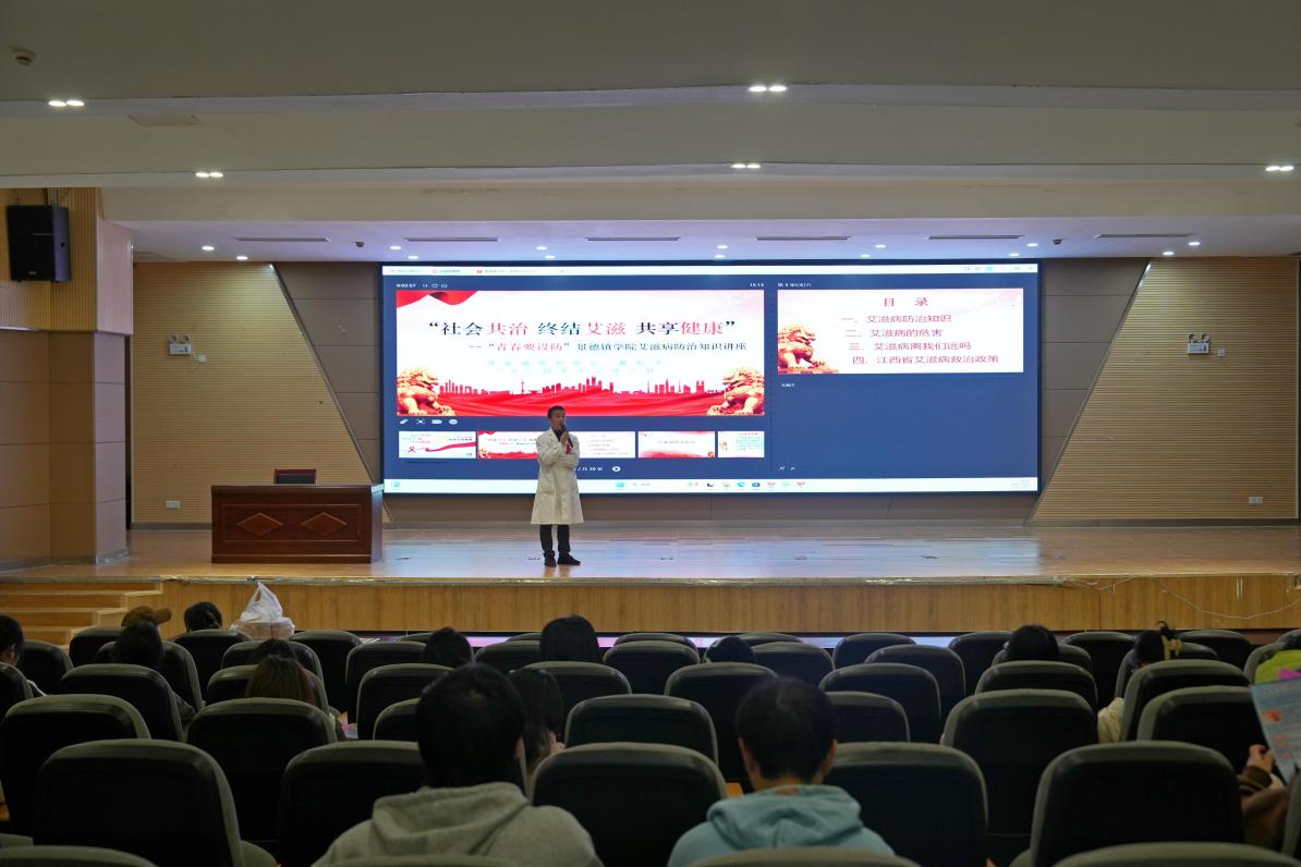 (本网讯:文|杜雨翰/图|廖翊君、胥晴、胡露婷)为深入提升全校师生对艾滋病的认知水平,增强自我防范意识,扎实推进学校预防艾滋病教育工作开展,营造师生广泛参与艾滋病防治工作的良好氛围。12月3日下午,我校在图文报告厅开展了“世界艾滋病日”宣传教育活动,活动特邀景德镇市浮梁县疾控中心戴松才医生以“社会共治,终结艾滋,共享健康”为主题作宣讲。