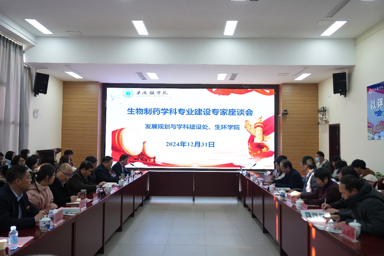 (本网讯:文|廖翊君、胥晴/图|胥晴、刘欢欢、郭诗蕊)为全面提升学科专业内涵建设水平和激发二级学院高质量发展的新活力,12月31日上午,我校在第一报告厅召开了生物制药学科专业建设专家座谈会。校党委副书记、校长熊震宇,副校长黄志坚,科研处处长杨波、产教融合中心主任余少军出席会议。座谈会特邀中国中医科学院中药研究所研究员王跃生,北京市药品检验研究院主任药师余立,江西中医药大学药学院院长刘荣华,江西中医药大学教授金一,江西中医药大学教授陈兰英,中药固体制剂制造技术国家工程研究中心总工程师龚建平,北京中医药大学第三附属医院临床药学副主任王焱来我校给予学科专业建设指导。