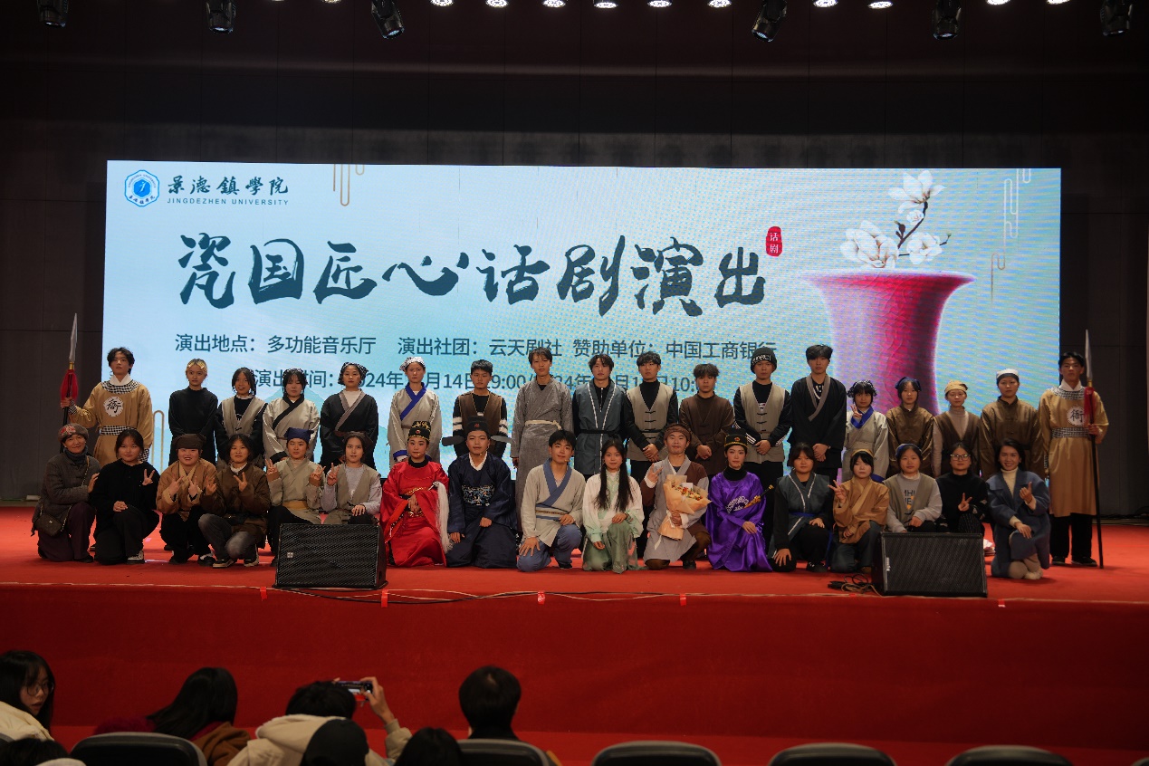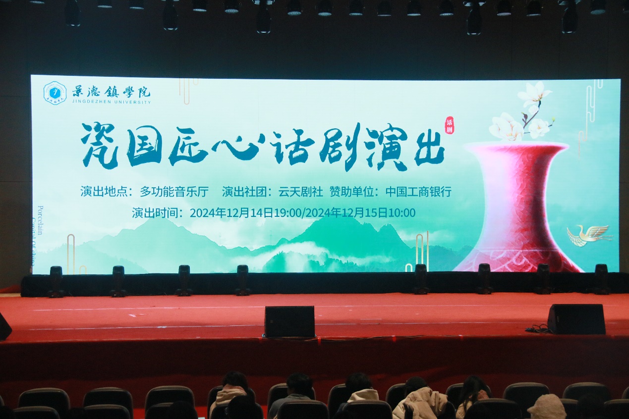 (本网讯:文|盛佳怡/图|张怡婷、盛佳怡、司晴)12月14日晚七点,景德镇学院原创话剧《瓷国匠心》在校音乐厅顺利上演。该剧由我校云天剧社指导老师朱景燕指导,社团学生倾情演绎,为观众呈现了一场思想与艺术交融的视听盛宴。