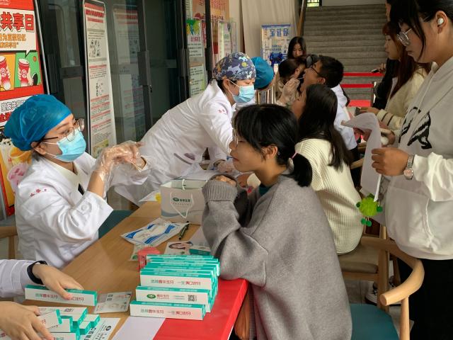 义诊活动在在校一食堂门口举办,同学们有序排队,咨询口腔健康问题,医生耐心进行解答,并进行初步检查诊断,提出治疗方案。公益讲座在第三教学楼3201教室举办,主讲医师从“口腔常见疾病预防”“科学保护牙齿”“口腔健康小知识”三个方面的内容给大家讲授,同学们认真聆听,积极提问,咨询了关于出现牙周炎、智齿时如何缓解疼痛等问题,医生耐心解答并现场为同学们检查。活动最后昌华玉牙口腔医院为到场同学发放纪念小礼品,呼吁大家注意口腔问题的防护。