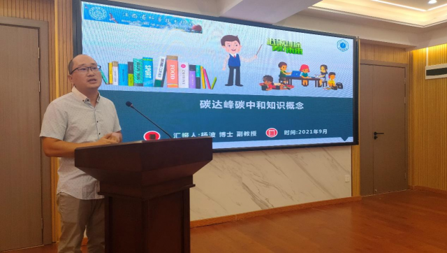我校杨波博士应邀作为主讲嘉宾,结合个人的研究领域及方向,以《碳达峰、碳中和知识概念》为题,从碳达峰、碳中和的主要概念、全球变暖的严重性、各国相关主要政策、目前距离目标差距、实现碳中和的方式、碳中和下的生活等六个方面作全面讲解,深入浅出地阐述了党中央做好碳达峰、碳中和重大战略决策部署对我国经济社会发展的深远影响,以及做好碳达峰、碳中和工作的具体思路和方法。讲座内容详实,事例丰富,既有政策性、又有实践性,具有很强的针对性和指导性。