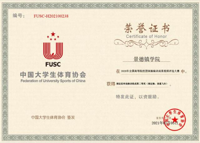 (本网讯:占韦)近日,我校体育学院编排的作品《浪遏飞舟》在中国大学生体育协会组织的2020年中国大学生健康活力“云”系列大赛暨2020年全国高等院校团体操编训成果视频评选大赛评选中,荣获规定组单场操二等奖的好成绩,为学校争得了荣誉!