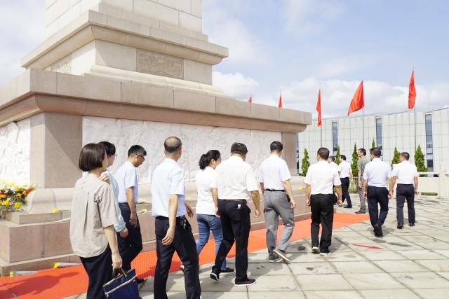 烈士陵园内,革命烈士纪念碑巍然耸立,庄严肃穆。伴随着庄严高亢的旋律,全场齐声高唱《中华人民共和国国歌》。国歌唱毕,全场肃立,向烈士默哀致敬。默哀毕,国旗护卫队稳稳抬起花蓝,缓步走向烈士纪念碑,将花篮摆放到纪念碑基座上。校党委书记李良智缓步上前,仔细整理花篮缎带。在李良智的带领下,全体成员郑重的举起右拳,重温入党誓词,许下为共产主义奋斗终身的誓言。最后,全体成员一起瞻仰烈士纪念碑,向永垂不朽的人民英烈们寄托哀思、表达敬意。