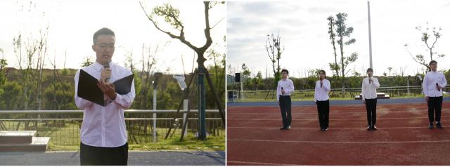 早上7时,升旗仪式在田径场隆重举行,伴随着庄严的国歌声,五星红旗冉冉升起,全体师生齐唱国歌、行注目礼。