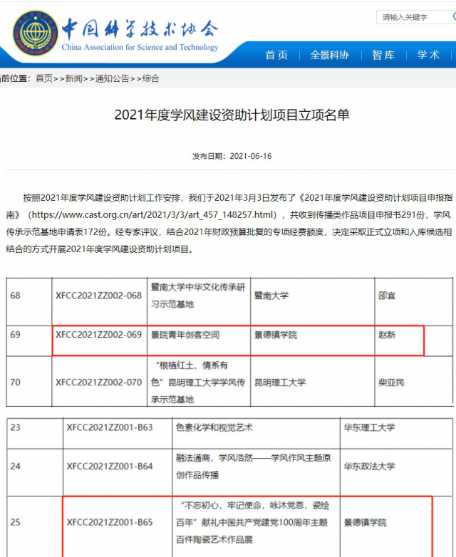 (本网讯:黄超)近日,由中国科协主办的《2021年度学风建设资助计划项目立项名单》结果公布,校团委、创新创业学院赵新老师申报的《“景院青年”创客空间》(项目编号XFCC2021ZZ002-069)和《“不忘初心,牢记使命,咏沐党恩,瓷绘百年”献礼中国共产党建党100周年主题百件陶瓷艺术作品展》(项目编号XFCC2021ZZ001-B65)两个项目,通过专家评议,从463份高校申报项目中脱颖而出,分别获批“学风传承示范基地”(江西省唯一入选)与“传播类作品”立项(江西省仅两项入选)。