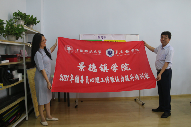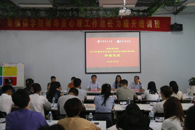 (本网讯:董帅)7月12日,我校2021年辅导员心理工作胜任力提升培训班开班仪式在大学生心理健康教育中心团辅教室举行,校党委委员、副校长郑昕芾、江西师范大学心理教育中心主任王敬群教授及其专业团队教师出席,学工处负责人陈后辉主持仪式。
