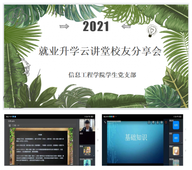 (本网讯:胡欣)为深入推进党史学习教育,助力学生成长成才,切实开展好“我为师生办实事”主题实践活动。近日,信息工程学院学生党支部举办就业升学云讲堂校友分享会,学生党支部书记胡欣主持分享会。