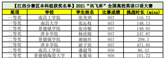 经过为期一周的激烈角逐,通过A.I.智能评分和专家人工评分,江西省共评出100名获奖选手。其中一等奖2人,二等奖6人,三等奖12人,优秀奖80人。我校9名同学获奖,其中2019级英语专业的张诗敏同学和2019级商务英语专业的谢丽丝同学分别以总分第三名和第五名的成绩获得了江西赛区本科组二等奖。丁雨晴同学获得三等奖,6位同学获得优秀奖。我校获得优秀组织奖。