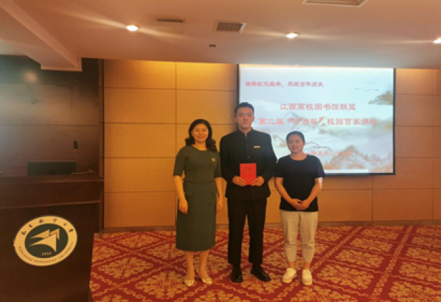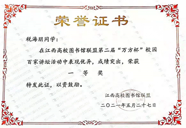 (本网讯:邓倩玲)5月27日,江西省高校图书馆联盟第二届“万方杯”校园百家讲坛演讲比赛火热开展,我校18级工美陶绘1班税海朋同学荣获一等奖。