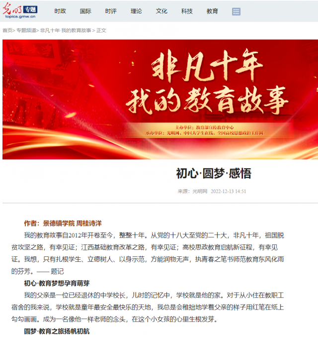 (本网讯:景苑轩)我校教师周桂诗洋的故事《初心·圆梦·感悟》入选教育部宣传教育中心开展的“非凡十年·我的教育故事”宣传教育活动,并在光明网刊登。