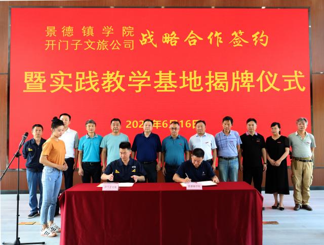 (本网讯:刘斌权)6月16日上午,我校与开门子文旅公司战略合作协议签约暨实践教学基地揭牌仪式在高岭中国村举行,校党委副书记、校长陈雨前,黑猫集团党委书记、董事局主席、开门子文旅公司董事长王耀出席签约仪式并为实践教学基地揭牌。校党委委员、副校长吴丁与黑猫集团总经理助理、开门子文旅公司总经理徐熠共同签订了景德镇学院与开门子文旅公司战略合作协议。签约仪式由黑猫集团副总经理、开门子文旅公司党支部书记胡卫华主持。