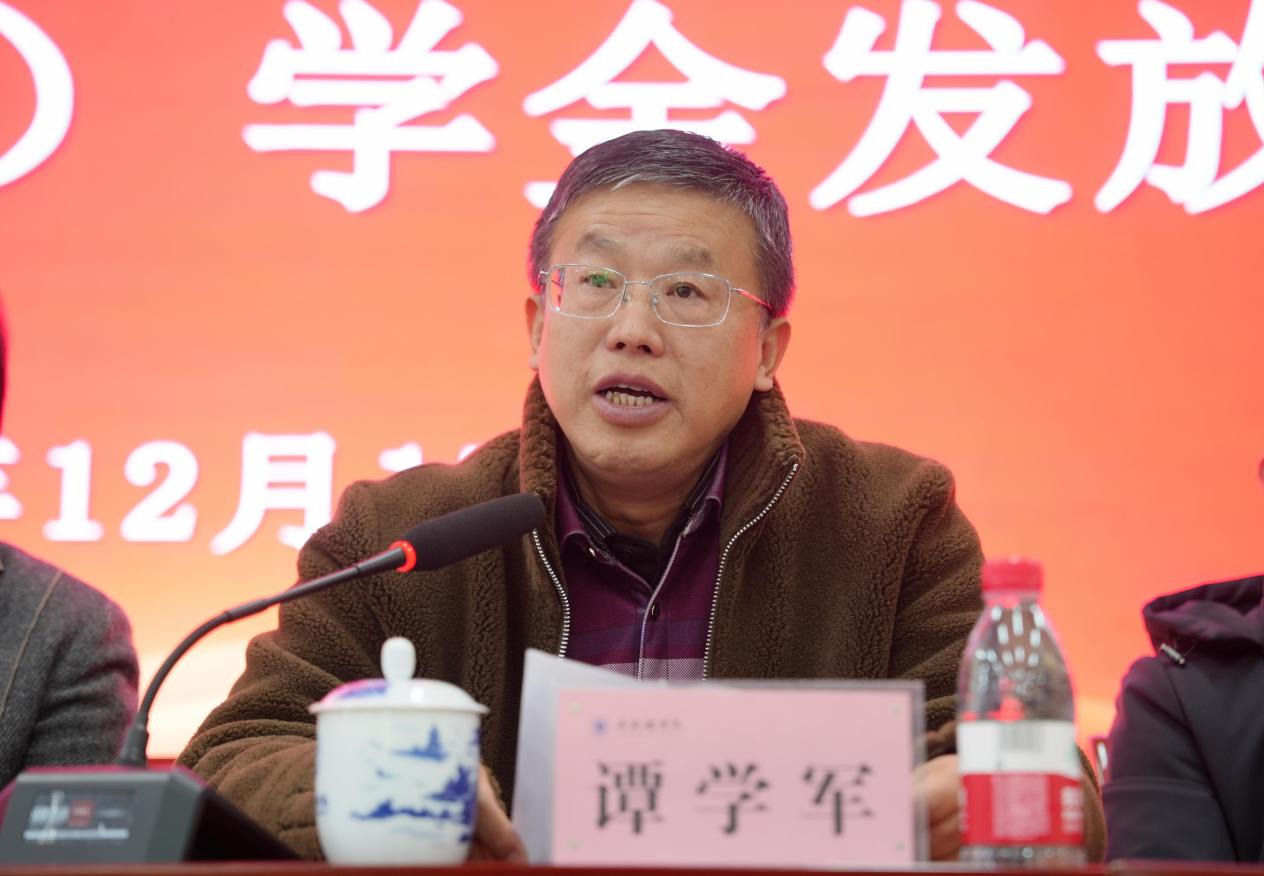 谭学军受市关工委主任张景根委托,向获得启航奖助学金的同学表示祝贺,向学校老师和领导致敬。他表示,市关工委遵照习近平总书记重要指示精神,高度重视青少年工作,自2019年起已连续五年与景德镇学院联合举办相关活动。本年度共有30名优秀学子获得每人3000元的励志帮困助学金。他向同学们提出三点希望:一是自强不息,坚定信念,要把困难当历练,树立正确三观,将个人抱负与国家命运紧密相连,勇担时代重任;二是努力学习,早日成才,珍惜学习生涯,化关爱为动力,增长才干,成为祖国栋梁;三是传递爱心,回报社会,铭记关爱,感恩党和社会,传递爱心,回馈社会、报效祖国、建设家乡。