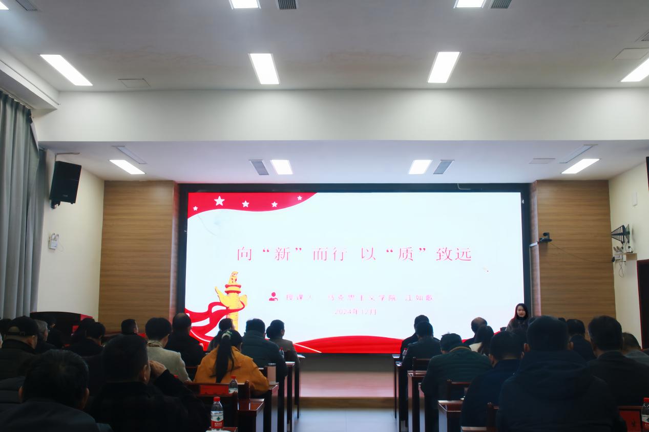 随后,马克思主义学院江如歌老师以“向‘新’而行,以‘质’致远”为题作专题辅导,对党的二十届三中全会所阐释的新质生产力的相关内容进行了深度解读与剖析。
