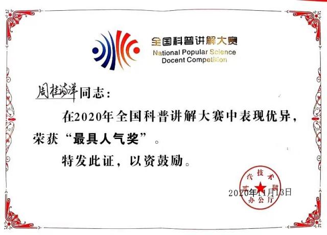 在刚刚结束的2020年全国科普讲解大赛中,我校青年教师周桂诗洋荣获全国科普讲解大赛二等奖并获得最具人气奖。