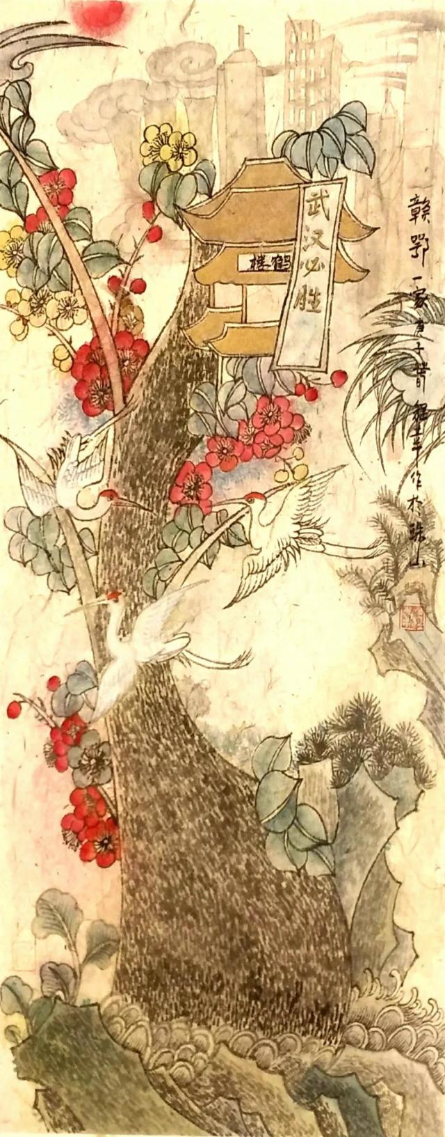 作品说明:图中通过对武汉标志性建筑物黄鹤楼的描绘,并以梅花、白鹤等元素辅之,生动再现了湖北、江西是一家,江西人民全力支持湖北人民抗击新冠肺炎战斗,祝愿湖北人民早日健康平安,一方有难,八方支援,赣鄂一家亲。