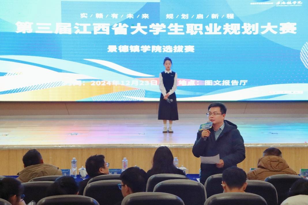 (本网讯:彭雨佳)为推动我校学生持续增强职业规划意识,不断提升就业综合竞争力,并为未来职业发展奠定良好基础,12月23日下午,景德镇学院第三届大学生职业规划大赛决赛在校图文报告厅成功举办。大赛邀请了江西工艺美术与职业技术学院团委副书记陈婧、人文学院党委副书记万雪平、外国语学院党委副书记黄华、机电学院党委副书记何晖、体育学院党委副书记潘洪涛作为评委,同时邀请到首届全国大学生职业规划大赛金奖指导老师、江西师范大学刘清华教授担任总评委。