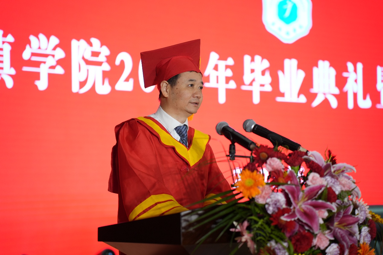 熊震宇以“秉持校训精神,做攀登者、奉献者、先行者”为题,带领毕业生们共同回顾了过去几年国家发展的辉煌历程,聚焦校园点滴变化,细数学校近年来在环境改善与服务优化方面的努力,对毕业生们在校期间取得的优异成绩给予了高度赞扬,他对毕业生提出殷切期望,鼓励他们在未来的人生道路上,继续保持拼搏奋进的精神,以青春之我创造青春之未来。鼓励他们坚持自强不息,做砥砺奋斗、敢破藩篱的攀登者,以砥砺奋斗熔铸征途的基石,于千难万险里守护理想绽放;坚持泽土惠民,做赤诚报国、心有大我的奉献者,将个人的理想追求融入到国家和民族的事业之中,以赤子之心书写人生华章;坚持知行合一,做埋头实干、勇立潮头的先行者,将课本所学知识和校训精神融入工作实践中,以“逢山开路、遇水架桥”的实干精神闯关夺隘,敢于担时代重任、勇立潮头,在“卡脖子”处突破重围,在无人区里开辟新途。