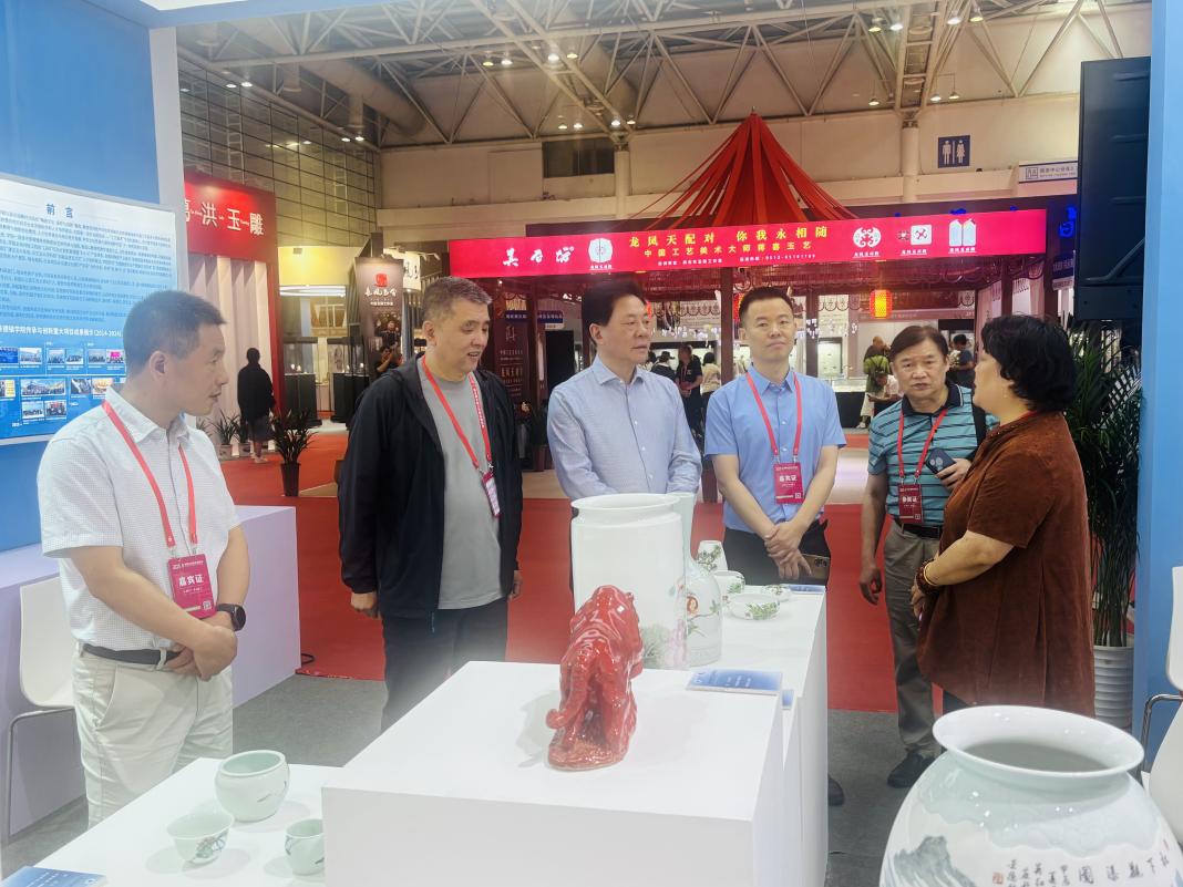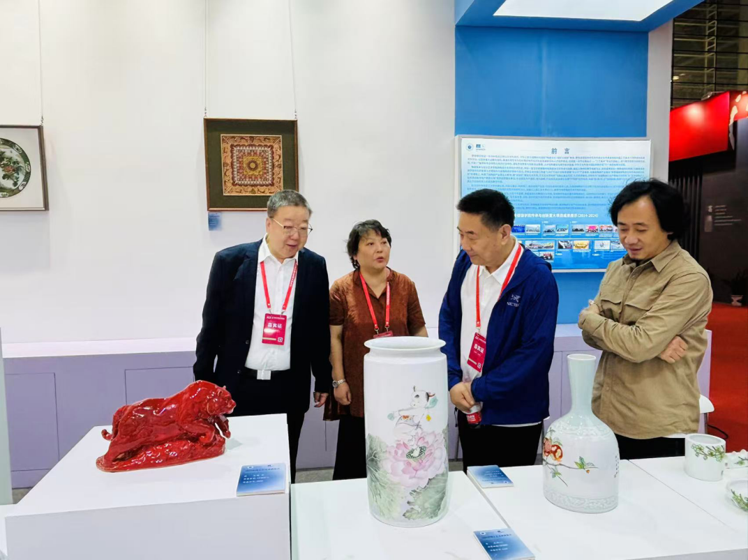 陶瓷美术与设计艺术学院副院长程幸为中国工艺美术协会王志杰驻会副会长介绍作品