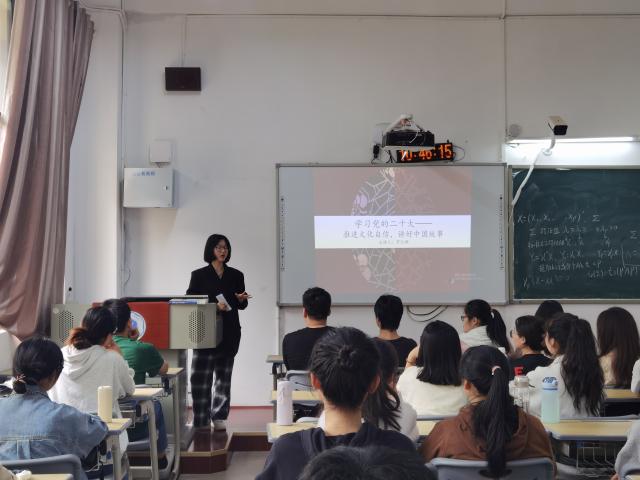 罗之璇围绕“坚持马克思主义指导地位”“如何践行社会主义核心价值观”“如何提高文化软实力”三个方面展开宣讲,列举了当下活跃在银幕上的文史类节目,引导同学们了解文化软实力的内涵并与同学们展开热烈的讨论。