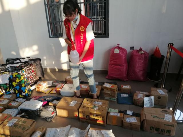 面对每天送来的近三千件包裹,志愿者们必须完成收件、清点、消毒、分类等一系列准备工作,最终将包裹集中在各学生公寓一楼大厅休息区,再分时段、分楼层登记领取包裹。