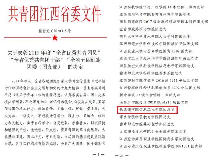 (本网讯:吕云飞)近日,共青团江西省委下发《关于表彰2019年度“全省优秀共青团员”“全省优秀共青团干部”“全省五四红旗团委(团支部)”的决定》(赣青发〔2020〕8号),我校信息工程学院团委喜获2019年度“全省五四红旗团总支”荣誉称号。