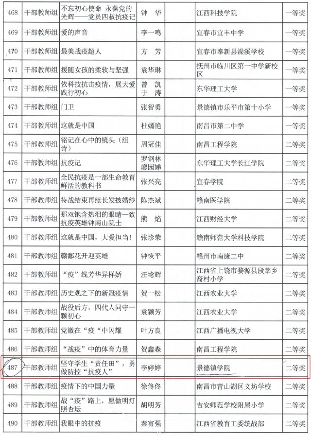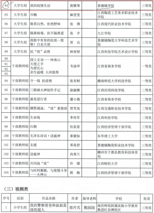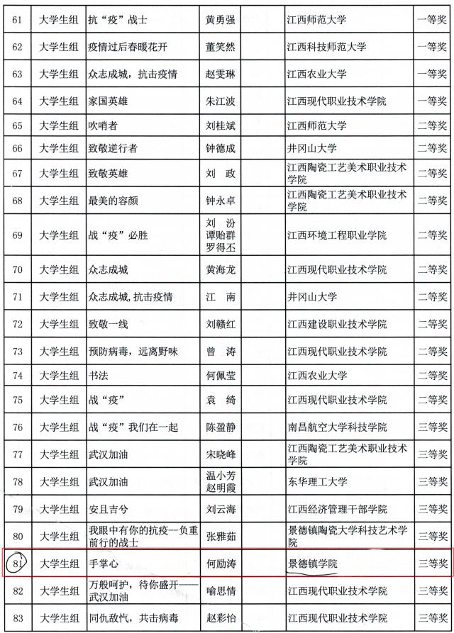 (本网讯:汪万鹏)6月8日,省委教育工委、省教育厅下发《关于公布战“疫”主题征文活动获奖名单的通知》文件,我校选送的作品《坚守学生“责任田”,勇做防控“抗疫人”》作者:李婷婷(教育学院教师)荣获干部教师组文章类二等奖;《手掌心》作者:何励涛(艺术学院学生)荣获大学生组绘画类三等奖;《我的疫情生活》作者:郭雅琴(艺术学院学生)荣获大学生组绘画类三等奖。