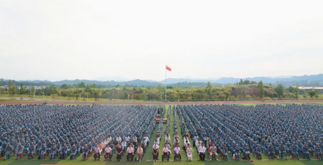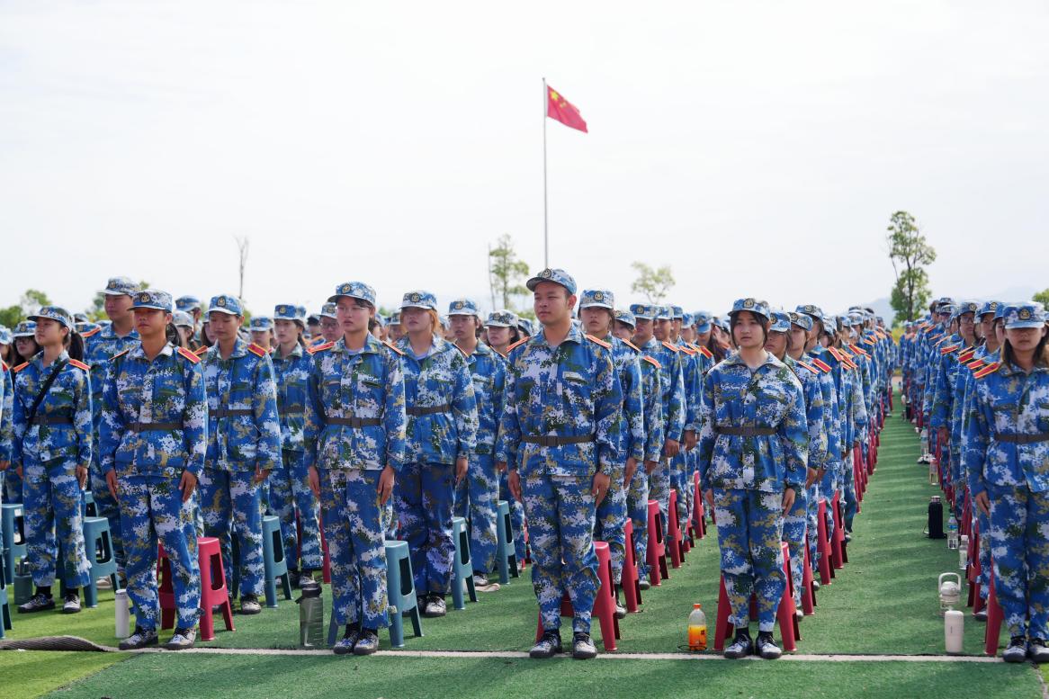 典礼在雄壮的国歌声中拉开帷幕,迎着冉冉朝阳,24级新生身着迷彩服,怀揣着梦想与希冀,排好方阵整齐屹立在田径运动场,注视着五星红旗升起。