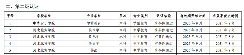 (本网讯:质评处)近日,教育部办公厅发布《关于公布2025年通过普通高等学校师范类专业认证专业名单及中期审核专业名单的通知》(教师厅函﹝2025﹞18号),我校师范专业建设再传捷报,英语、学前教育、美术学专业顺利通过教育部师范类专业第二级认证,认证有效期为2025年9月—2031年8月。
