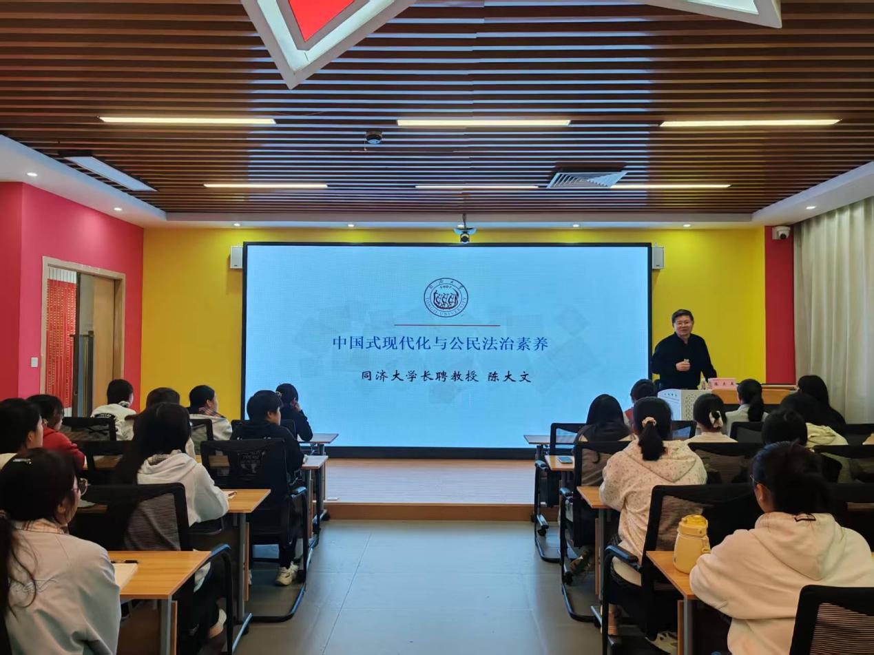 (本网讯:马克思主义学院)为深入阐释中国式现代化的法治内涵,引导青年学子铸牢法治信仰、提升法治素养,11月3日上午,同济大学陈大文教授应邀来我校马克思主义学院为思想政治教育专业的学生带来了一场题为“中国式现代化与公民法治素养”的专题思政课。校党委书记陈小林,校党委委员、宣传部部长赵雪政,马克思主义学院党委书记郝海旺、院长曹志瑜参加此次专题思政课活动。