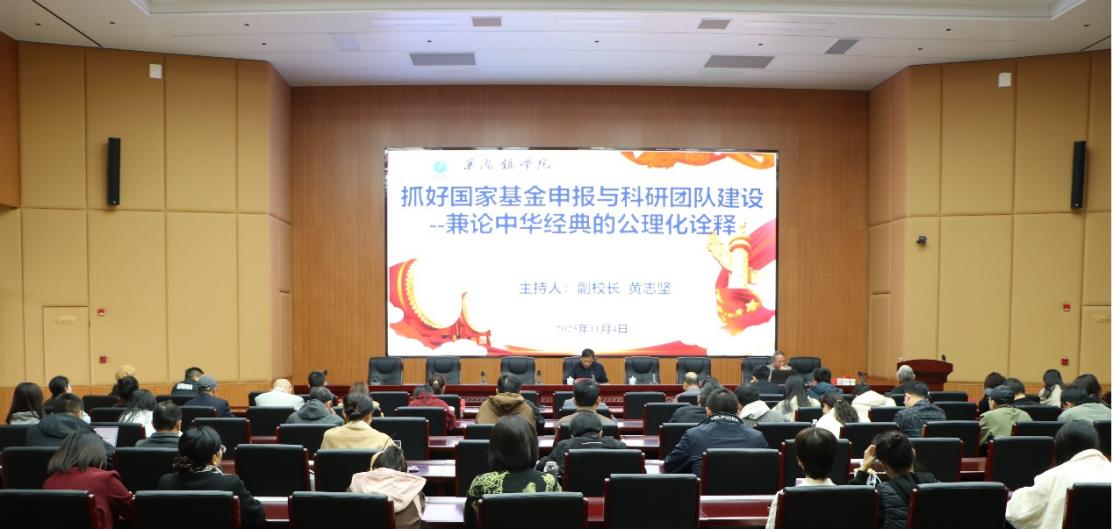 (本网讯:文|景苑轩/图|刘文静、王佳诺)为了激发科研活力、凝聚团队力量,推动我校科研工作实现内涵式、可持续的高质量发展。11月4日,我校特邀清华大学博士甘筱青教授进行“抓好国家基金与科研团队建设——兼论中华经典的公理化诠释”学术讲座。副校长黄志坚主持讲座,科研处负责人、各二级学院科研副院长、骨干教师及博士代表在第一报告厅参加此次活动。