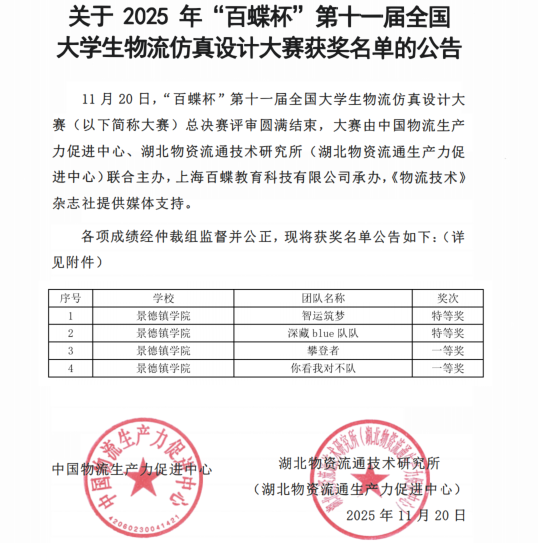 (本网讯:经济管理学院)近日,2025年“百蝶杯”第十一届全国大学生物流仿真设计大赛总决赛圆满落幕。作为纳入《普通高校大学生商科类竞赛指数》的国家级权威赛事,此次大赛吸引了全国29个省市自治区509所院校的1389支队伍同台竞技。我校经管学院选派的4支参赛队伍发挥出色,“智运筑梦”队与“深藏blue队”斩获最高荣誉——特等奖,“攀登者”队与“你看我对不”队荣获一等奖,成就了100%的高级别奖项获奖率。