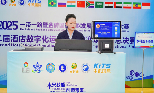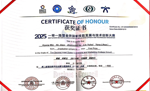 (本网讯:经济管理学院)近日,2025一带一路暨金砖国家技能发展与技术创新大赛第二届酒店数字化运营与营销赛项全国总决赛在云南德宏职业学院圆满落幕。经济管理学院2024级酒店管理班胡家玉、黄敏两名同学,在刘瑜辉、杨丽华老师的指导下,凭借扎实的专业能力斩获本科组一等奖,为我校赢得荣誉。