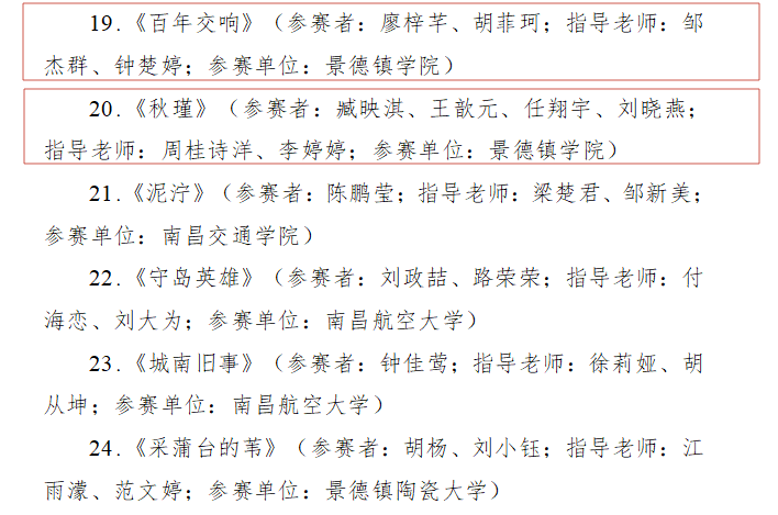 其中,作品《永不消逝的声音》(参赛者:杜佳骏、刘孟婷、钟佳玲;指导老师:周桂诗洋、李婷婷)和《百年交响》(参赛者:廖梓芊、胡菲珂;指导老师:邹杰群、钟楚婷)均荣获教育部主办的第七届中华经典诵写讲大赛大学生组优秀奖和省教育厅组织开展的“中华经典行 赣鄱好声音”系列活动暨第七届中华经典诵写讲大赛二等奖;而《秋瑾》(参赛者:臧映淇、王歆元、任翔宇、刘晓燕;指导老师:周桂诗洋、李婷婷)和《我有一束光》(参赛者:赵婷艳、陈宇博、葛敏康、廖有昊、李佳佳、朱雨捷、陈燕;指导老师:占梦婷、曹星)则分别获得“中华经典行 赣鄱好声音”系列活动暨第七届中华经典诵写讲大赛二等奖和三等奖。