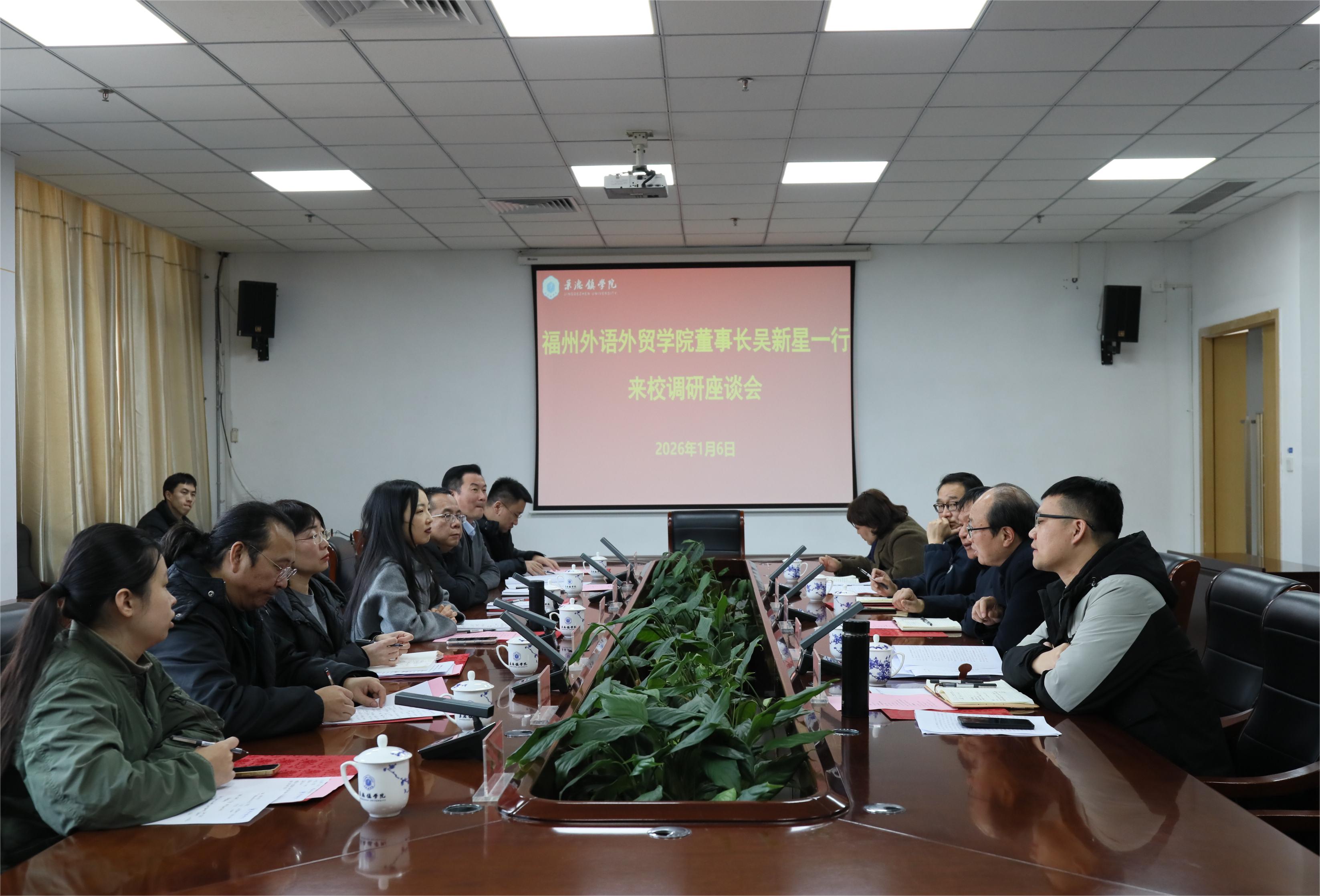 (本网讯:文|王佳诺/图|郑媛、王佳诺)1月6日下午,福州外语外贸学院董事长吴新星、执行校长黄建平、 宣传部部长路华一行来我校进行调研。校党委书记陈小林、副校长黄志坚,党委委员、宣传部部长赵雪政陪同调研。