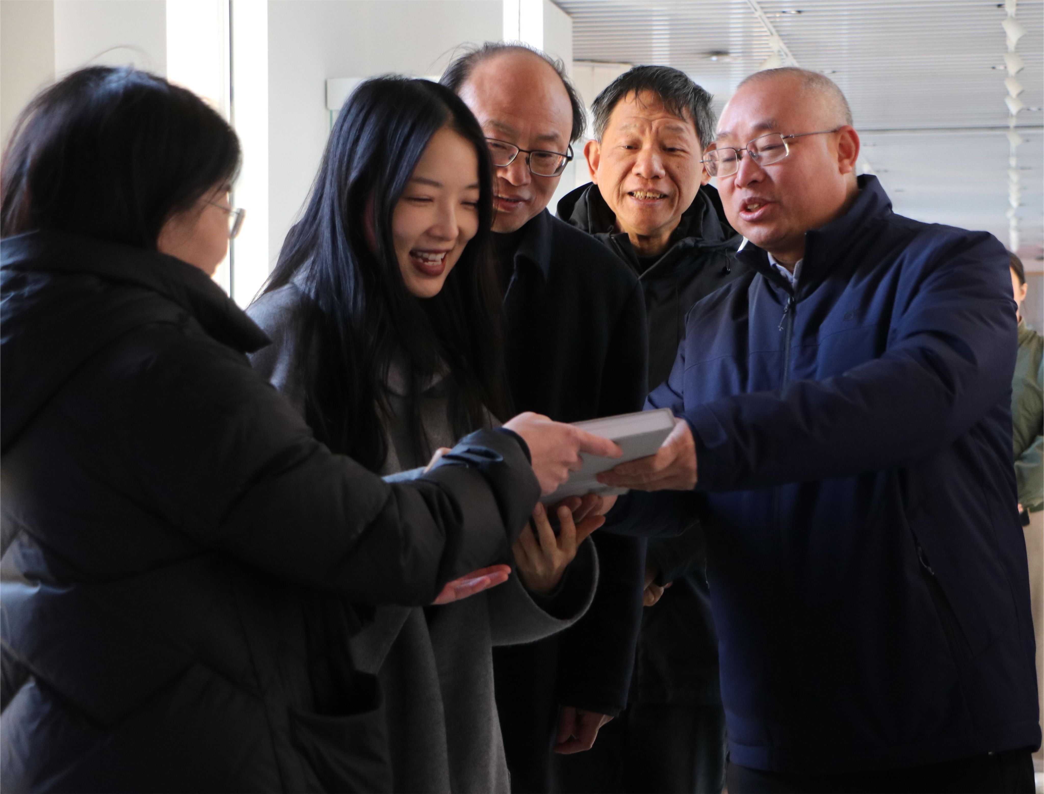 美术馆内陈小林(右一)赠书给吴新星(左二)