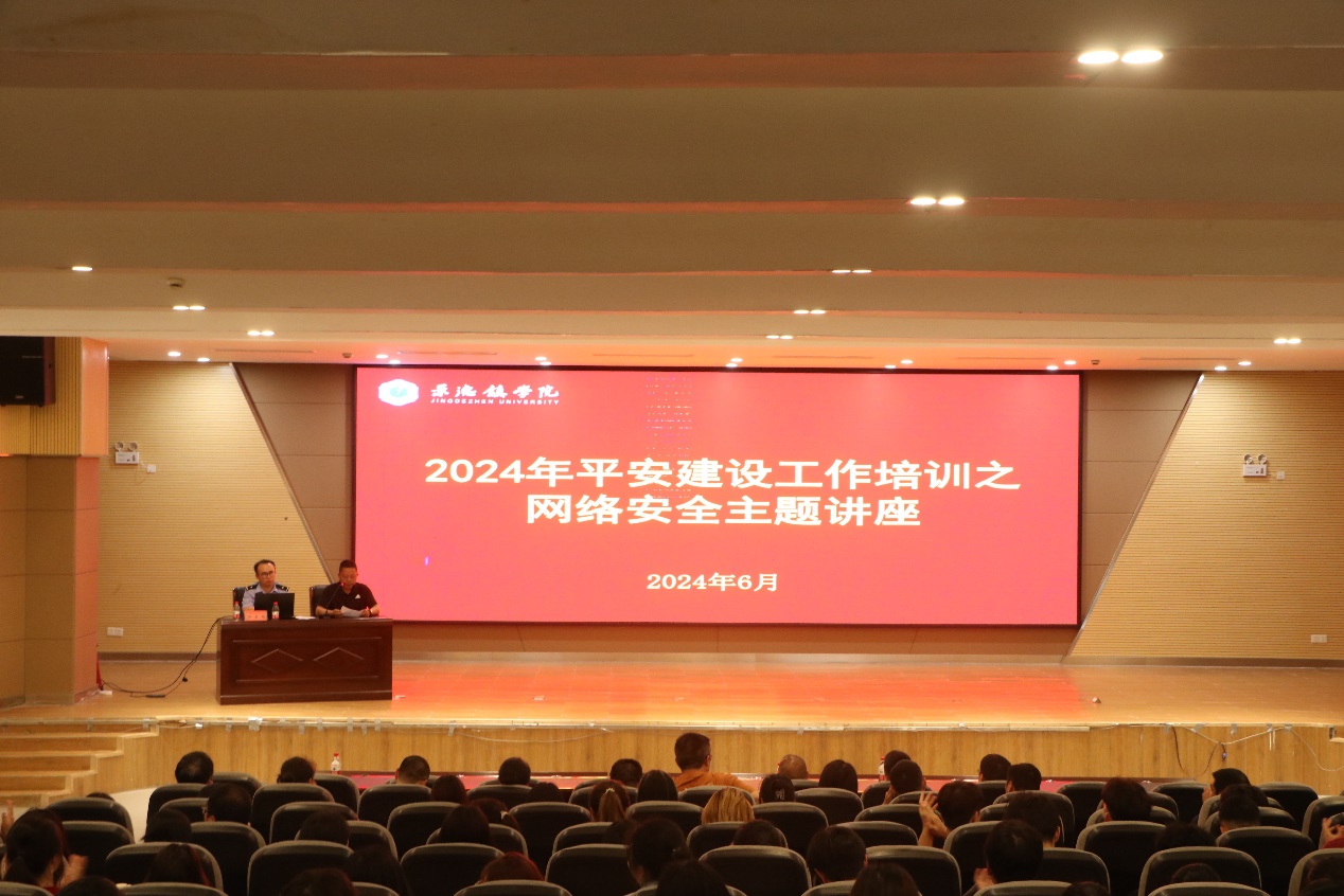 (本网讯:文|戴佳乐/图|丁绍华)为加强大学生网络安全意识,6月13日下午,我校邀请景德镇市公安局网安支队进校开展2024年平安建设工作培训之网络安全主题讲座活动。活动在图文报告厅举行,校党委宣传部网络与信息技术中心负责人、各二级学院副书记、平安建设工作联络人、全体辅导员、各二级学院学生代表、保卫处全体人员参加此次活动。