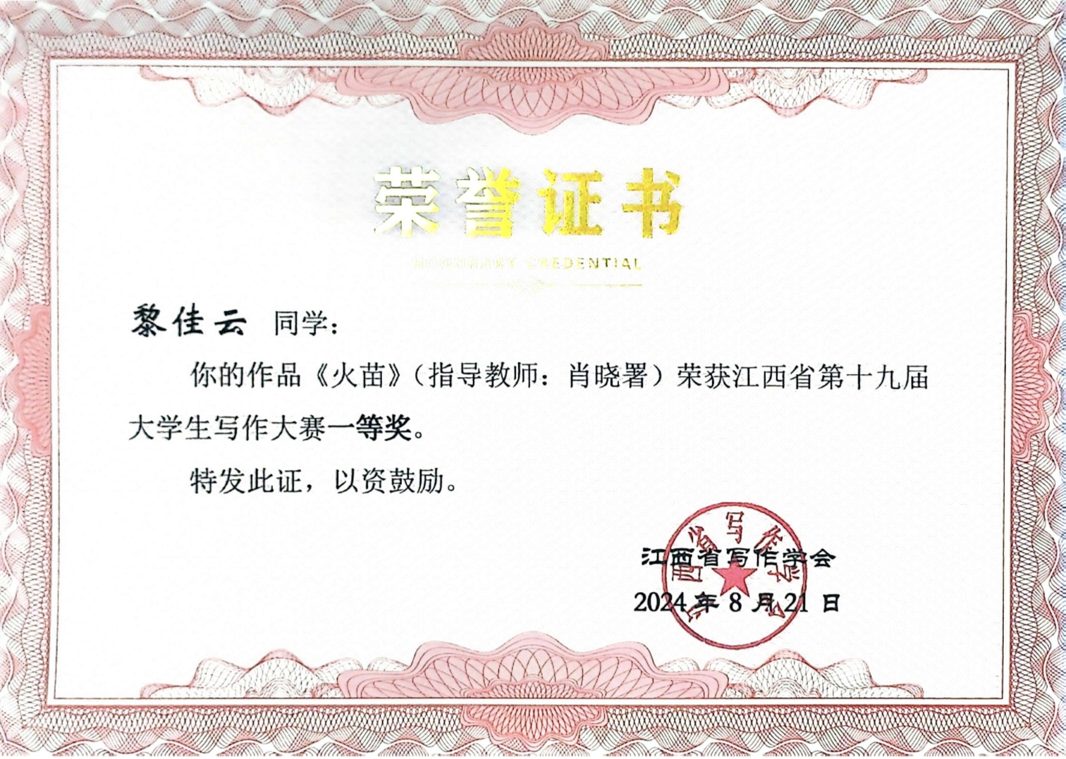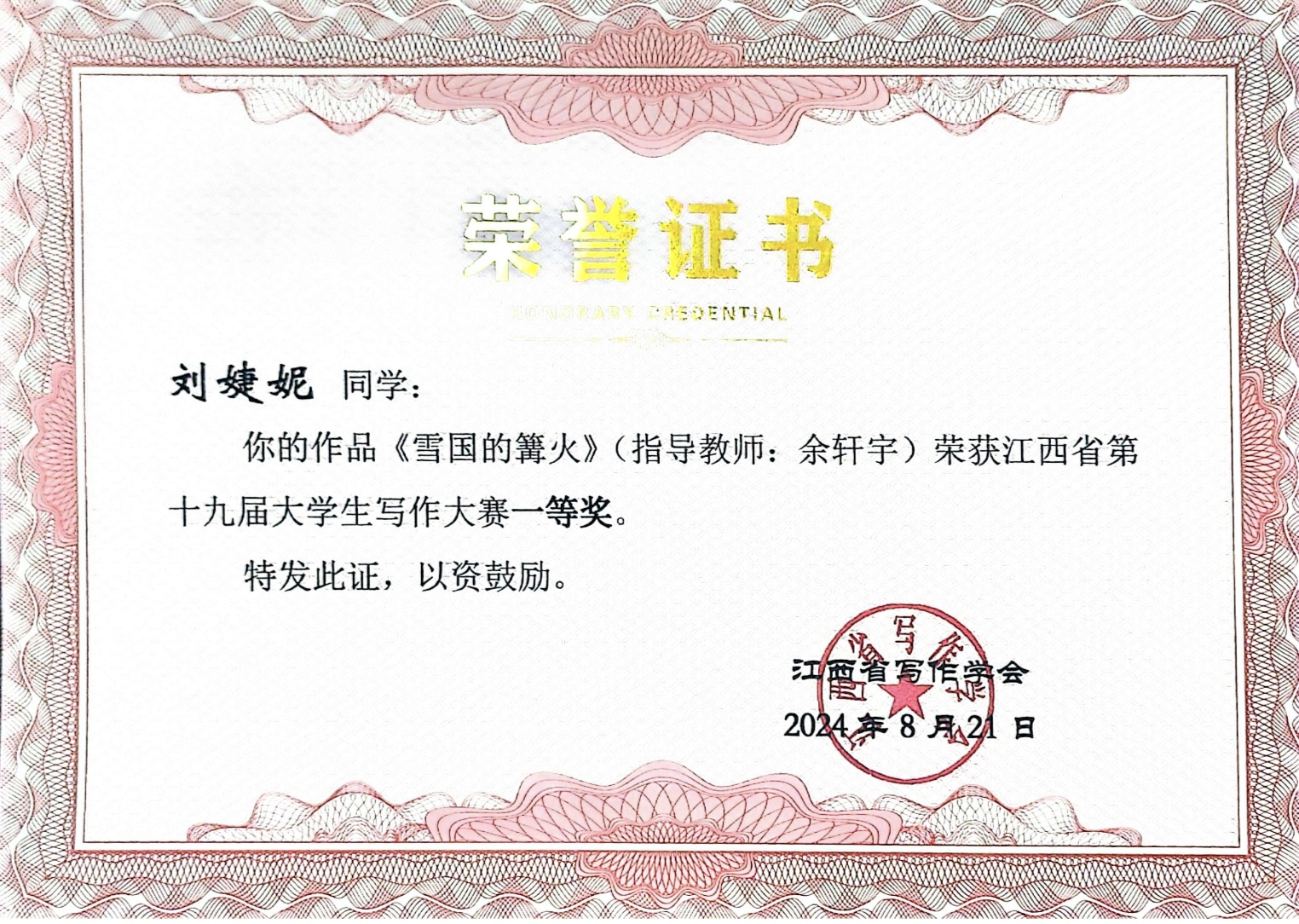 荣誉证书 人文学院供图