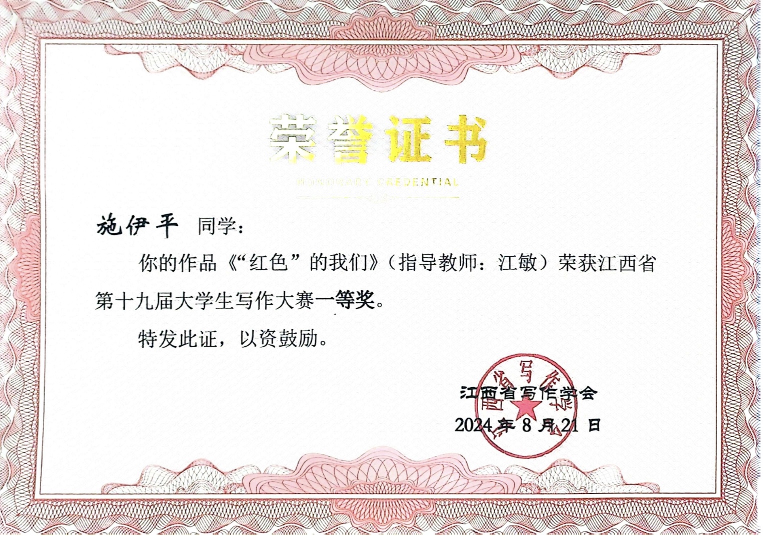 (本网讯:江敏)2024年8月,江西省第十九届大学生写作大赛终审在上海市举行,来自省内外各大高校的上千篇作品参赛角逐。近日,江西省写作协会传来喜讯,经大赛评委会最终审定,我校人文学院共有33篇参赛作品获奖,其中一等奖5篇,二等奖13篇,三等奖15篇。